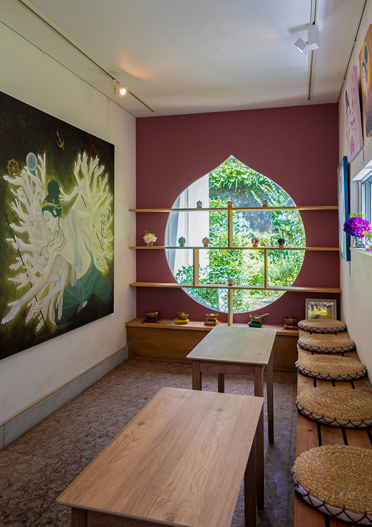 Inside the sunlit atelier, vibrant paintings focused on Buddhist themes, especially Kannon, fill the walls. A teardrop-shaped window near the entrance echoes the “treasure jewel” Buddha holds—a symbol believed to grant all wishes and embody the Buddha’s virtues. Entering this space, which blends naturally with its calm surroundings, a quiet joy settles as you prepare for a special creative moment.
