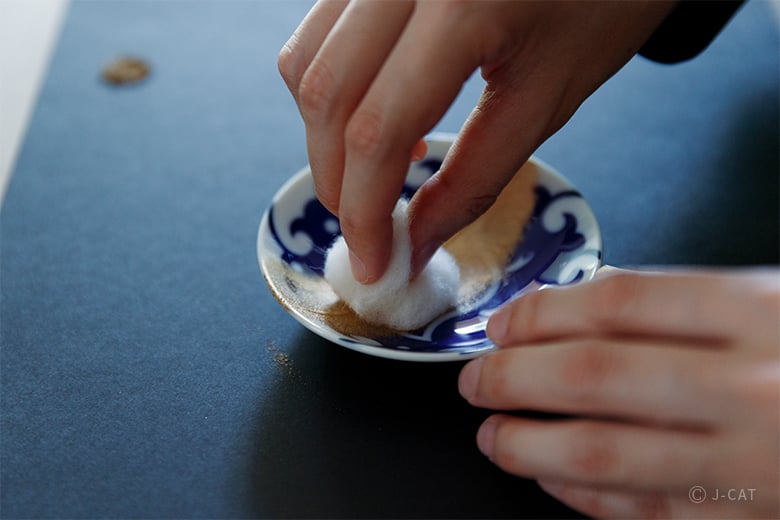 Finally, blend the applied brass powder in using gentle circles with cotton wool. When this is done, you can pack it for transport home, where it should be given a day to dry before being gently washed clean before use. You’ve probably never felt attachment to a dish like you’ll feel to a piece on which you’ve performed kintsugi with your own hand. As an option, you can also try aotsugi – using blue pigment in place of brass powder.