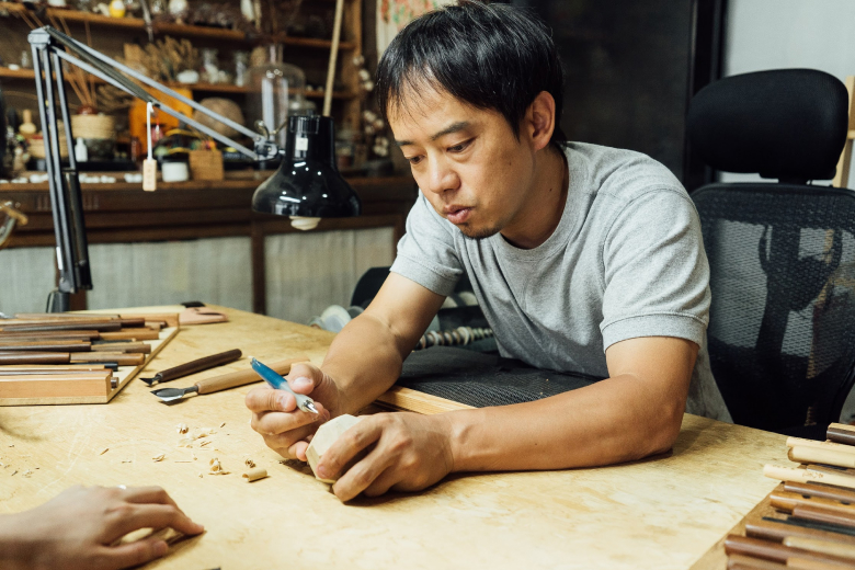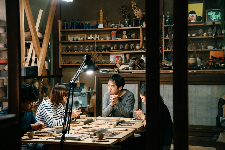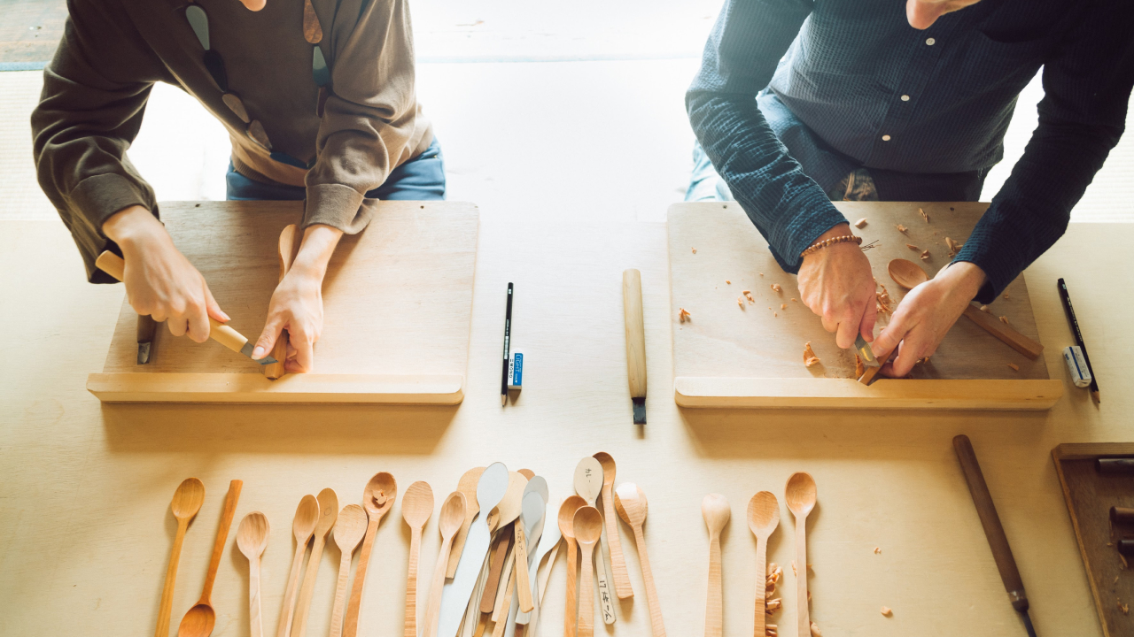 Through this exclusive Wabunka offer, you can choose to craft either a wooden spoon or pair of lacquered wooden chopsticks at the workshop. Tomoru Studio was founded in 2008 by woodcarver Komei Tanaka and his wife Sanae, who specializes in lacquerware art. If you decide to make a wooden spoon, Komei will show you how to design your piece and shape it with a carving knife, then finish it with natural beeswax. To make lacquerware chopsticks with Sanae, you will learn to mix and knead lacquer and pigment and apply it to the wood before setting your chopsticks to dry.