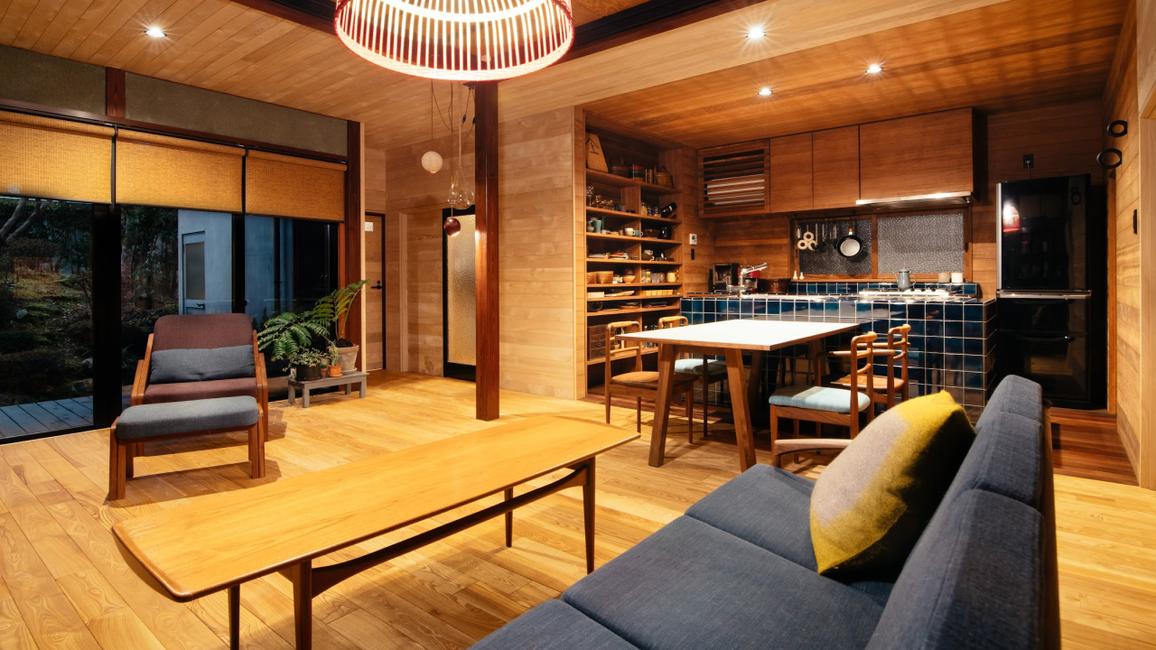 The interior of TATEGU-YA speaks to the local area’s deep connection with the surrounding forests. From lattice doors to floorboard, beams, and roofing, the villa is imbued with the gentle hues and varied grains of carefully-shaped natural wood. The overall effect is a pleasing blend of traditional wooden construction and stylish modern decor. On the first floor, you can relax together in the lounge area or spacious dining room next to the kitchen.