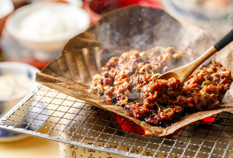 As part of your breakfast, you will be served a Hida delicacy known as hoba miso. This special local dish is made by grilling mushrooms and seasonal vegetables with miso and green onions on a magnolia leaf. At Ryokan Busuitei, however, hoba miso is made in the traditional way developed by a previous proprietor of the establishment, mixing miso with Hida green onions and grilling it over charcoal on a magnolia leaf.. Hoba miso is best enjoyed with rice.