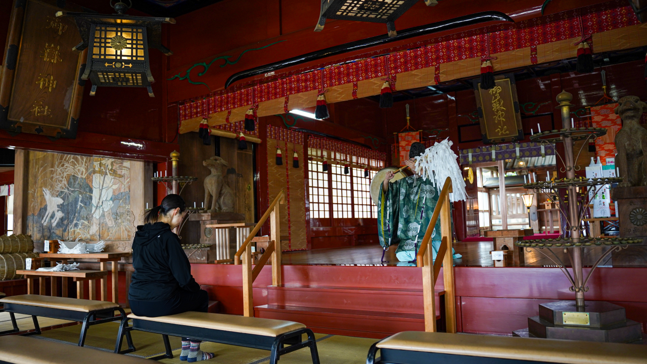 From this point on the tour, you can choose to continue with either the Cultural Course or the Shugendo Hiking Course. If you select the Cultural Course, you will participate in a traditional ceremony of purification and prayer within the shrine’s main hall led by the head priest. Amidst the quiet solemnity of this hallowed place, listen to the beat of the drum and the recitation of prayers to the kami. For your part, you will present a branch from the sacred sakaki tree as an offering. Following the ceremony, your guide will lead you on a tour of the shrine and its grounds.