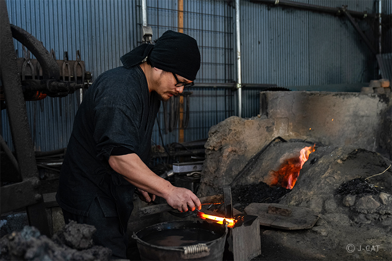 After you arrive, Nodoka will demonstrate how to operate the shop’s prized tatara, a traditional forge fed by a foot-operated bellows. While tatara once produced all of Japan’s famously top quality steel, they are exceedingly rare today, used mostly to produce high-grade tamahagane steel for ornamental and ceremonial swords and knives. As murage, Nodoka is responsible for managing the temperature and condition of the tatara forge.