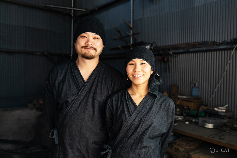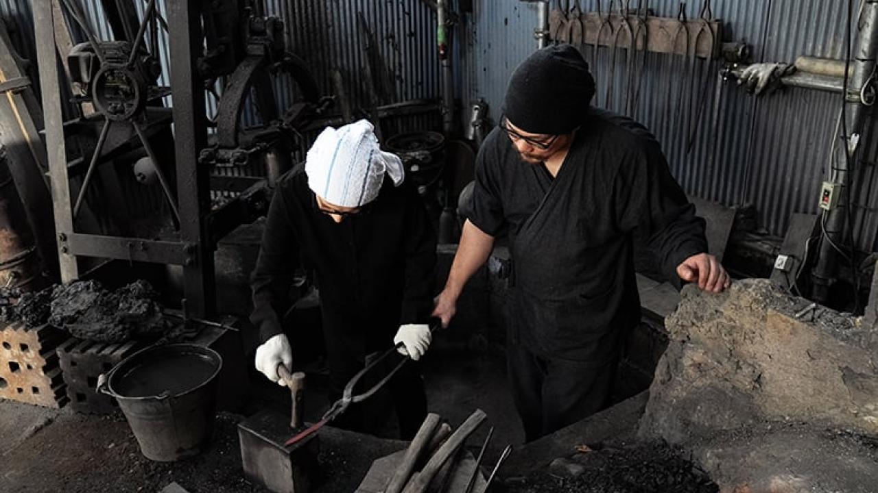 Just a short 15-minute drive from Satologue back down the road along the Tamagawa River, the small city of Ome is home to a remarkable couple, Sukehira and Nodoka Hirata. Together, they operate the traditional bladesmith’s shop Hirata Swordsmith, with Nodoka using her skills as a murage forge master to produce top quality tamahagane steel that toko blacksmith Sukehira shapes into blades using hammer, tongs, and anvil.