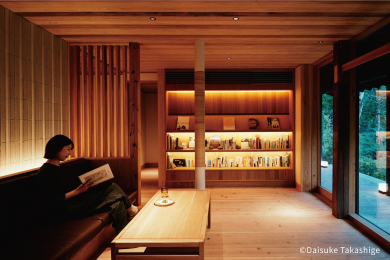 With plentiful use of natural wood in their construction, the guest rooms at Satologue were specially designed by architect Yasushi Horibe to encourage visitors to focus their eyes and ears outward into the natural world. Both beds and the sofa are oriented to face the glass doors, looking out across the Tamagawa River gorge with views of lush greenery. Outside is a balcony where you can sit back and relax as the river waters gurgle below and the wind swishes through the trees above.