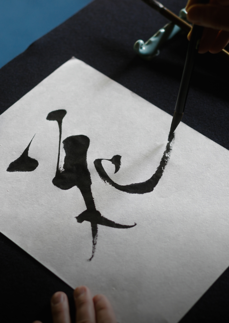 Calligraphy, or shodo, is the practice of writing characters with brush and ink in a way that shows both meaning and beauty. Each stroke is made in a single, continuous movement, so the pressure, speed, and pauses of the brush all appear directly on the paper. Viewers do not only read the characters. They also notice the balance of black and white, the rhythm of the lines, and the feeling of the person who wrote them. In Japan, calligraphy is learned in schools and private classes, and is used for formal writing such as New Year cards, ceremonial envelopes, and hanging scrolls in homes and temples.